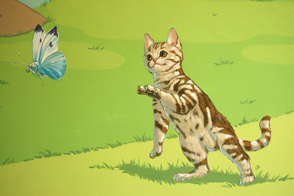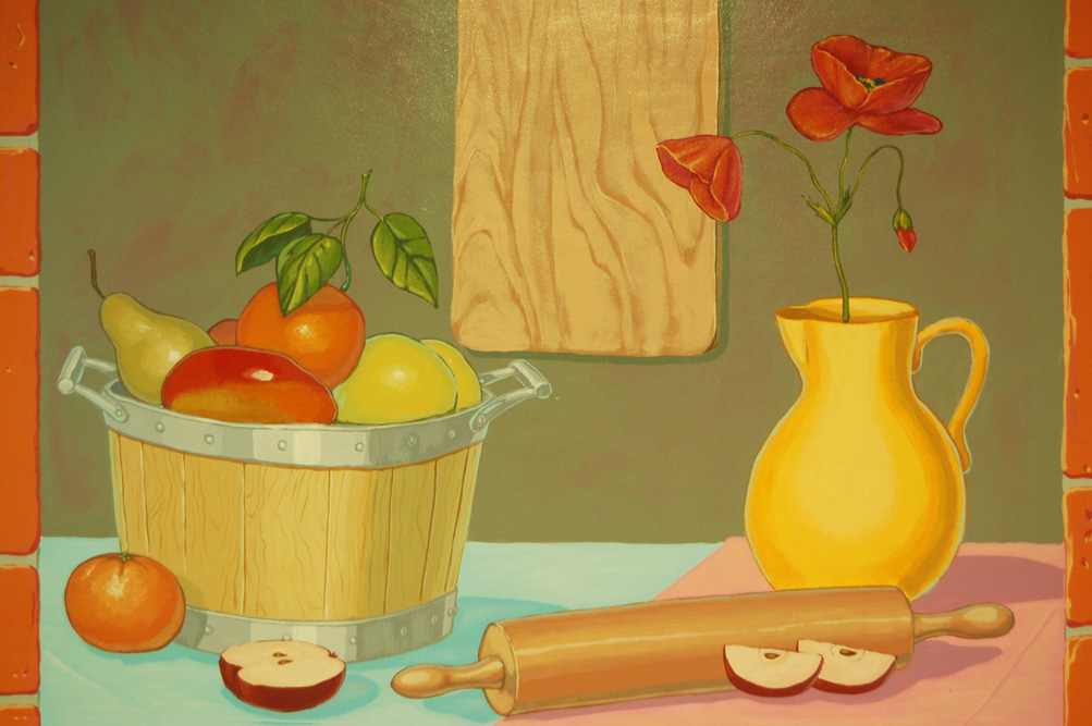 Un petit projet d’Anouk foundation dans une maison de retraite : décoration murale en forme d’ouverture sur les alpages. Le paysage est peu détaillé, ce qui fait ressortir les animaux. La difficulté a été dans certains détails, comme le regard joueur et souriant du chat. Dans deux salles à manger, j’ai fait des nature-mortes avec des fruits pour donner de l’appétit aux personnes agées. Là encore, les fruits contrastent avec l’absence de détails du fond.