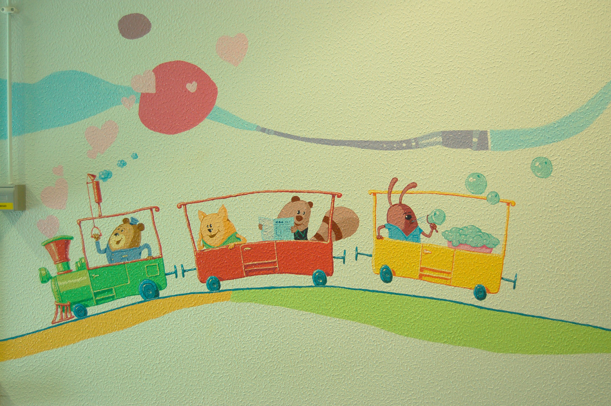 Un grand projet d’Anouk Foundation au Portugal. L’Hôpital est géré par une entreprise privée qui a son style graphique. On a dû adapter les personnages de la décoration en fonction de ce style. Cette fois on a fait une décoration pour les enfants et une pour les adultes.