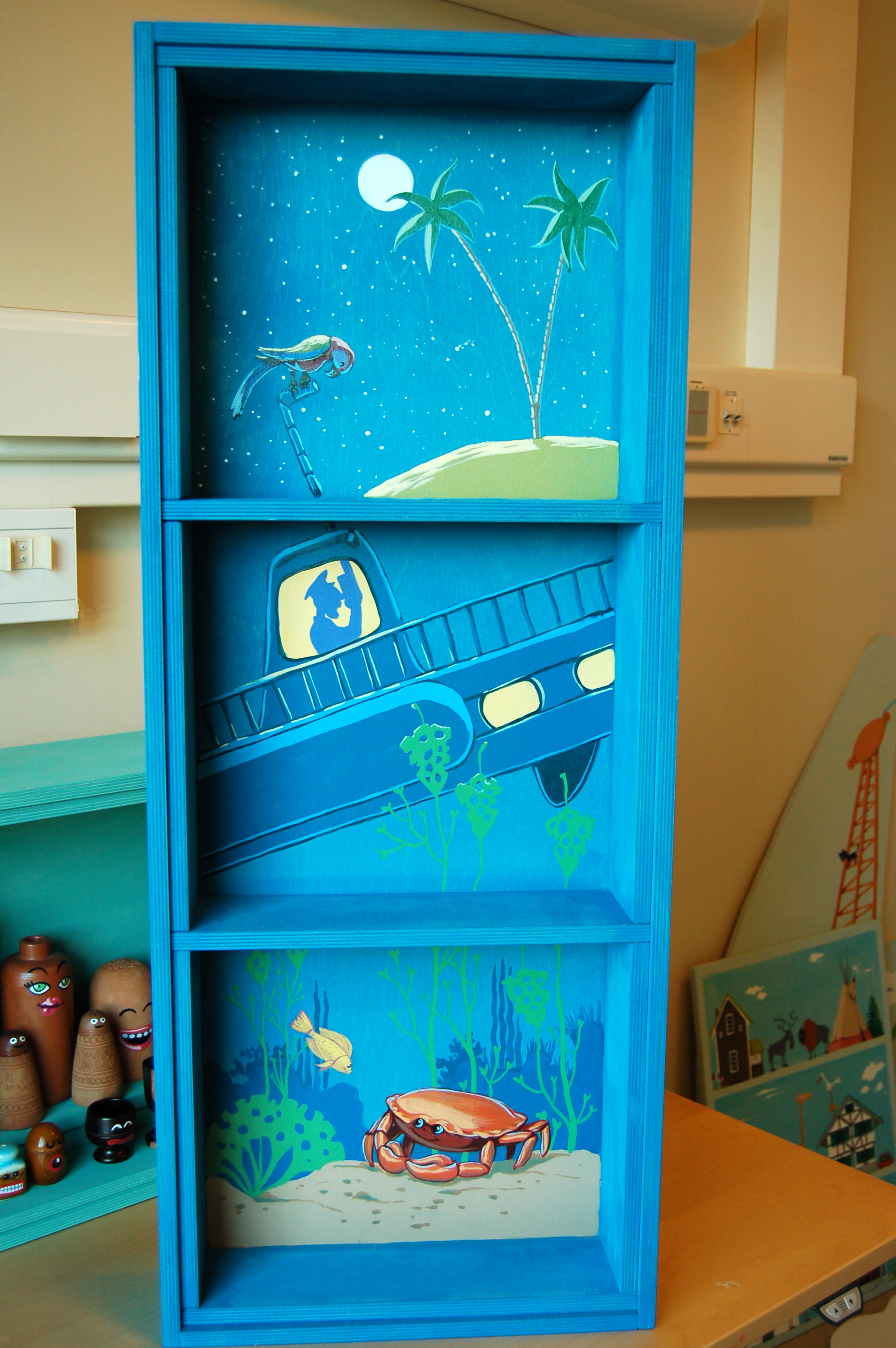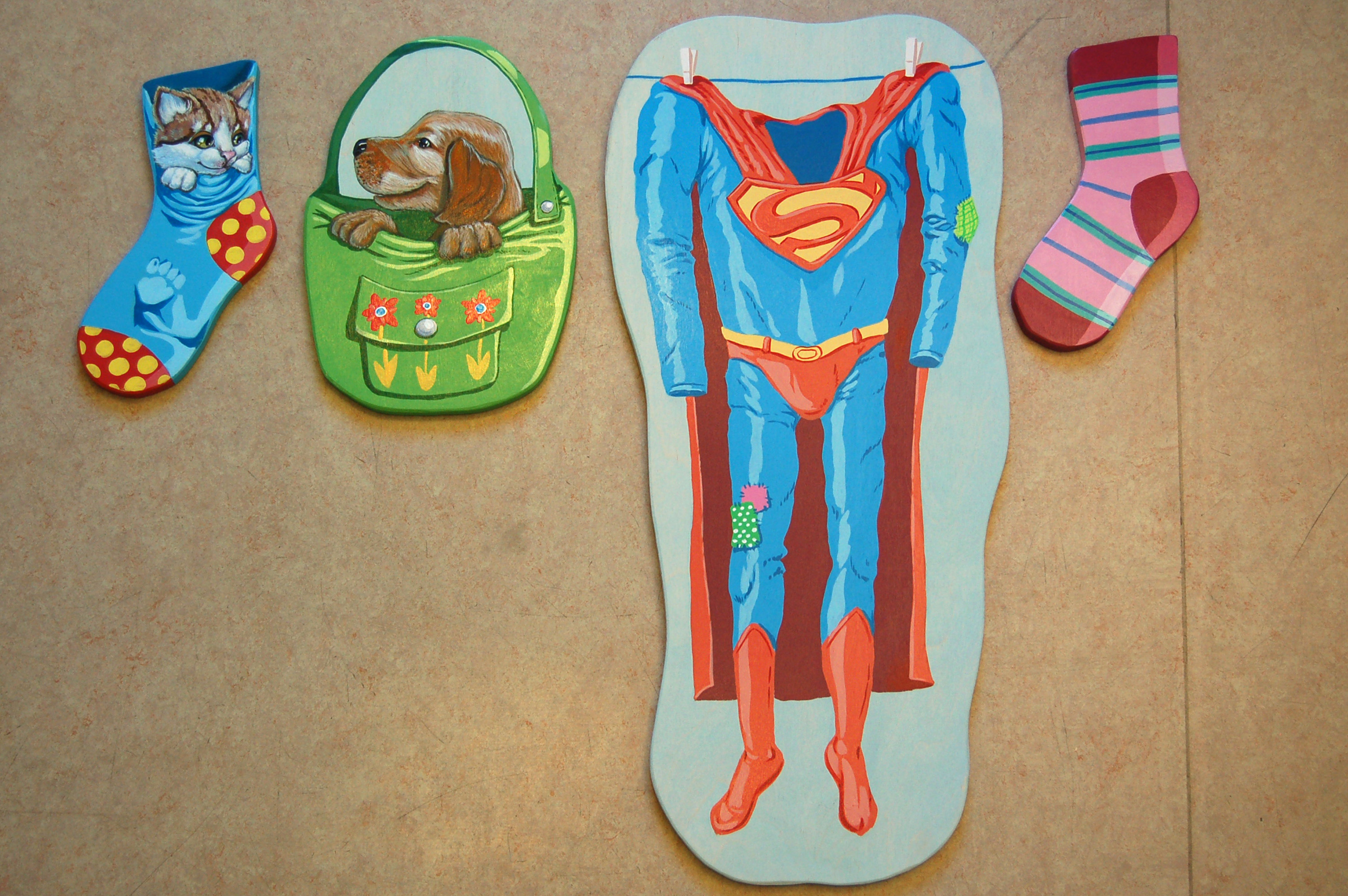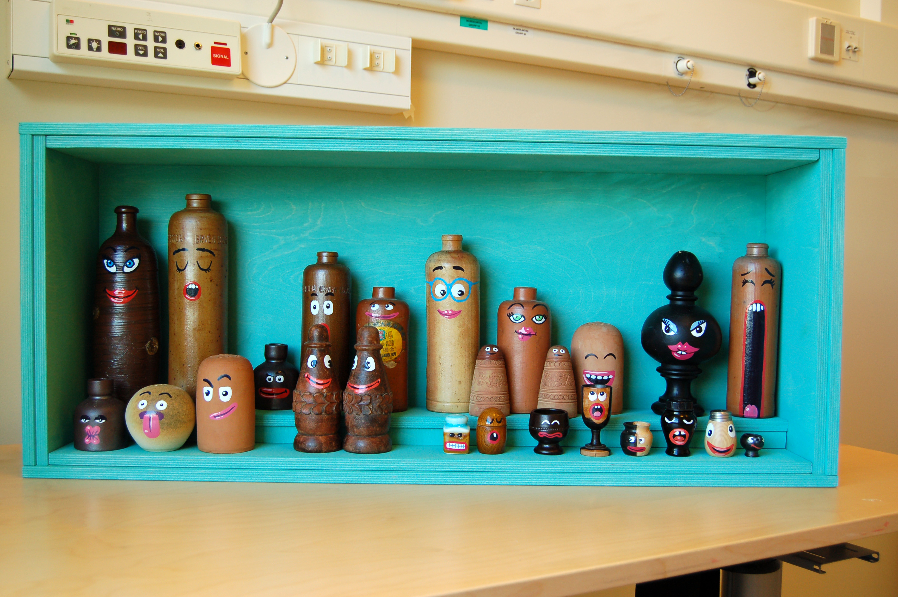 Deuxième projet d‘Anouk Foundation où nous avons travaillé avec notre designer suédois, Petter Ljungberg. Le souhait de l’hôpital se portant sur une décoration pour tous les âges, nous avons représenté des animaux et humains très réalistes, éloignés du style cartoon. L’idée de Petter consistait à tirer des lignes de différentes couleurs à partir de la réception jusque dans les différentes chambres. D’où vient cette idée d’objets suspendus ou attachés sur une corde? De la tradition scandinave de travailler avec le bois, en peinture diluée pour en laisser apparaître la veine. A noter aussi l’autre idée ludique de Petter de peinture sur bouteilles.